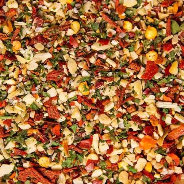 Inhaltsstoffe: 30% Bio-Knoblauch, Bio-Chili, Bio-Paprika, Salz, Bio-Pfeffer, Bio-Tomatenchips (Bio-Tomate, Bio-Maisstärke), Bio-Zwiebel, Bio-Petersilie, Bio-Zitrone