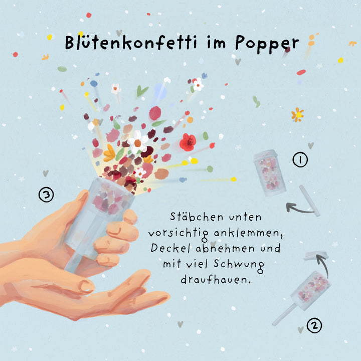 🎉 So einfach, so viel Freude: Stiel einsetzen, kräftig von unten auf den Popper hauen - und schon regnet es nachhaltiges Blütenkonfetti! Perfekt für Überraschungsmomente, Gruppenfotos oder einfach als Gute-Laune-Kick im Alltag.