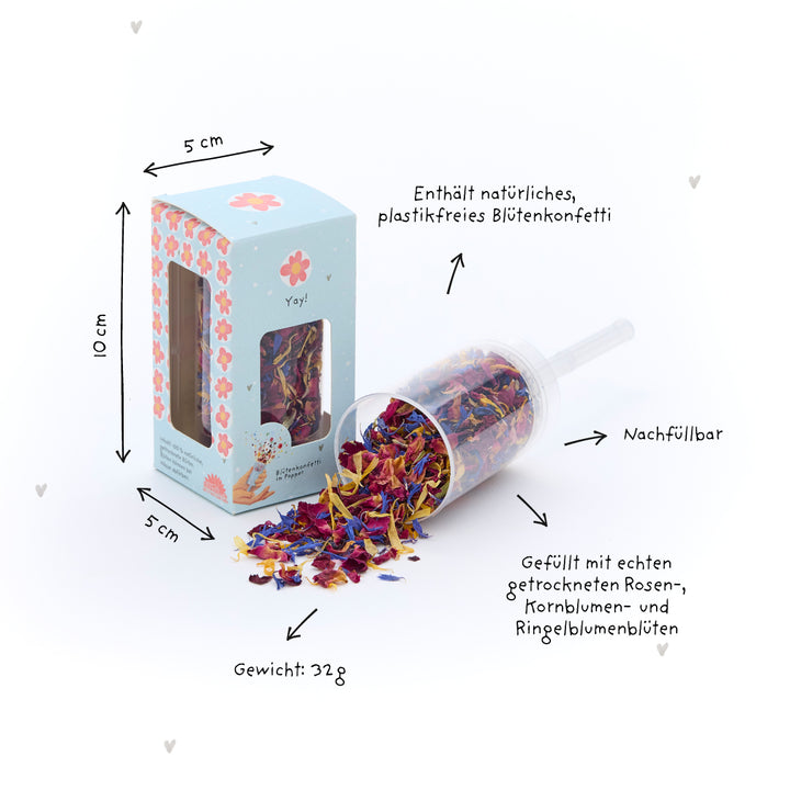 🌸 Konfetti direkt aus der Natur: Gefüllt mit wunderschönen getrockneten Blüten entsteht ein einzigartiges Naturkonfetti, das bezaubernd aussieht und jeden Anlass in einen bunten Glücksmoment verwandelt.