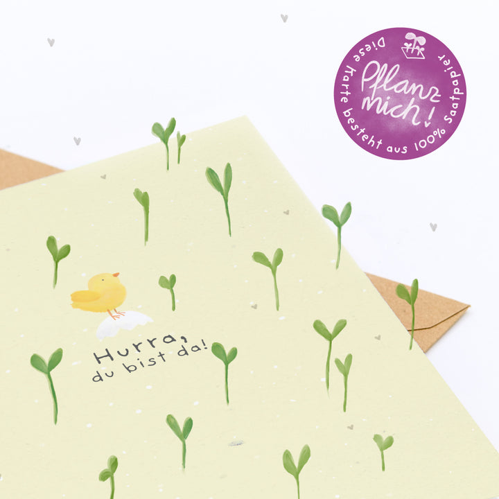Nachhaltig & plastikfrei: Die Karte ist aus kompostierbarem Saatpapier gefertigt, der Umschlag besteht aus Kraftpapier, die Hülle ist biologisch abbaubar - ein besonderer & nachhaltiger Gruß zur Geburt.