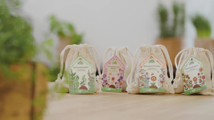 Nachhaltig: Die Saatkugeln werden einfach auf lockere Erde gelegt und regelmäßig gegossen – schon bald sprießen frische Kräuter. Das Säckchen besteht aus nachhaltiger, GOTS-zertifizierter Baumwolle und kann wunderbar wiederverwendet werden.