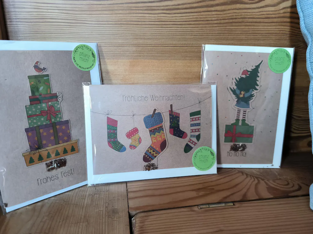 Wachsende Weihnachtsgrüße: Verschenke eine ganz besondere Weihnachtskarte – Das Geschenk-Motiv ist ein Saatstecker mit Saatgut, der abgelöst und eingepflanzt werden kann. So wachsen aus der Grußkarte später wunderschöne Wildblumen.