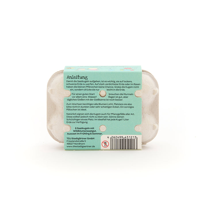Nachhaltig & plastikfrei verpackt: Die 6 bunten Blumenmurmeln werden im umweltfreundlichen Mini-Eierkarton geliefert – plastikfrei, liebevoll verpackt und ideal für umweltbewusste Eltern, Erzieherinnen und Veranstalter von Kindergeburtstagen und Gartenfesten.