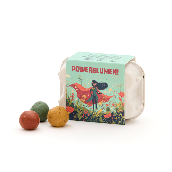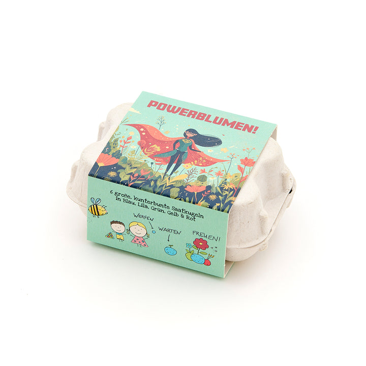 Tolles Geschenk für Superhelden: Aus den 6 bunten Blumenmurmeln im Mini-Eierkarton wachsen kunterbunte Wildblumen – perfekt für ein ganz besonderes Naturerlebnis für kleine Superhelden.